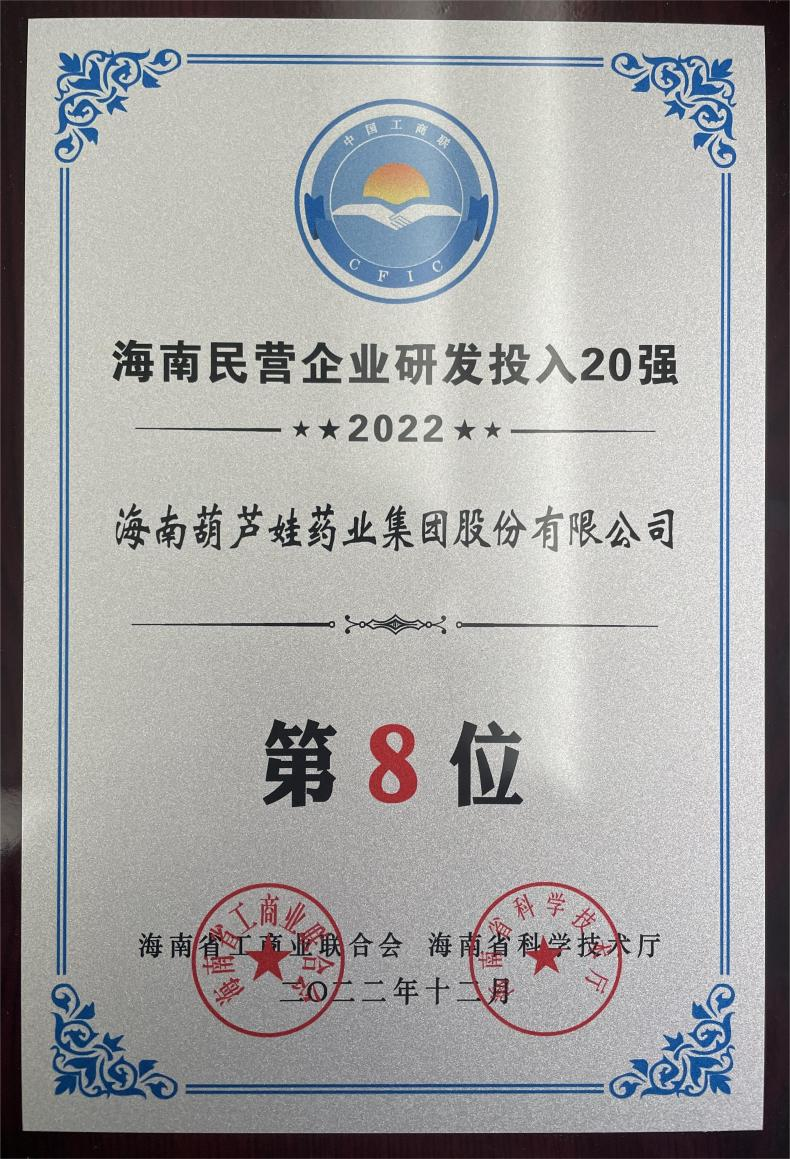 12月23日,2022海南民营企业50强和研发投入20强发布会在海口举行。会上发布了“2022海南民营企业50强”“2022海南民营企业研发投入20强”榜单和分析报告。28圈药业再次荣登两榜,在海南民营企业50强榜单中位列第25位,较去年上升8位,这也是公司连续三年登榜;在海南民营企业研发投入20强中位列第8位,较去年上升7位。